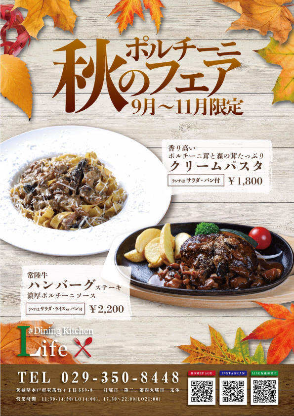 HOME > QOL > #Dining kitchen Life 新プランと秋のフェア 投稿日:2023年10月5日 #Dining kitchen Life 新プランと秋のフェアを開催中です。水戸市双葉台に佇む隠れ家的レストラン 「#Dining kitchen Life」皆さまのお越しをお待ちしております。https://qol-old.socxdesign.jp/qol-ltd/dkl/#Dining kitchen Life ホームページ -QOL, お知らせ